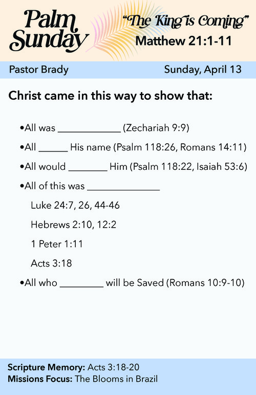 Posted in Palm Sunday, 2025, 4-13-2025, Pastor Brady Howard, Matthew 21, Zechariah 9, Psalm 118, Romans 14, Isaiah 53, Luke 24, Hebrews 2, Hebrews 12, 1 Peter 1, Acts 3, Romans 10