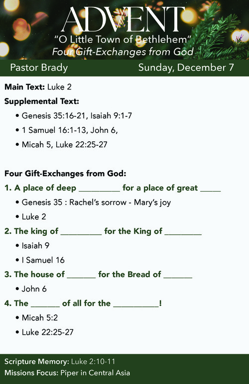 Posted in Advent, 2025, 12-7-2025, Luke 2, Genesis 35, Isaiah 9, 1 Samuel 16, John 6, Micah 5, Luke 22, Pastor Brady Howard