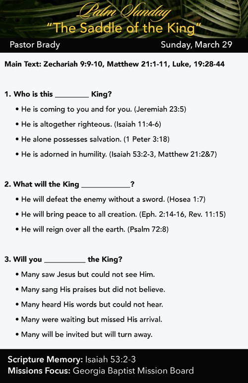 Posted in Palm Sunday, 2026, 3-29-2026, Pastor Brady Howard, Zechariah 9, Matthew 21, Luke 19, Jeremiah 23, Isaiah 11, 1 Peter 3, Isaiah 53, Hosea 1, Ephesians 2, Revelation 11, Psalm 72