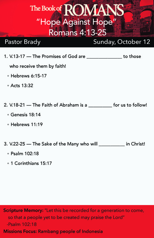 Posted in The Book of Romans, Romans 4, 2025, 10-12-2025, Pastor Brady Howard, Hebrews 6, Acts 13, Genesis 18, Hebrews 11, Psalm 102, 1 Corinthians 15